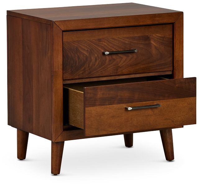 Making a statement at an affordable value, the Palmdale collection offers lasting styles for both your bedroom and dining room. Refine your most personal space with the nightstand’s mid-century appeal, which features an understated design with streamlined angles and a warm finish. Rich walnut veneers display a subtle sheen along Palmdale’s clean frame and splayed, tapered legs. Two drawers with shiny black handles address all your bedside needs, including a felt insert for the top drawer.