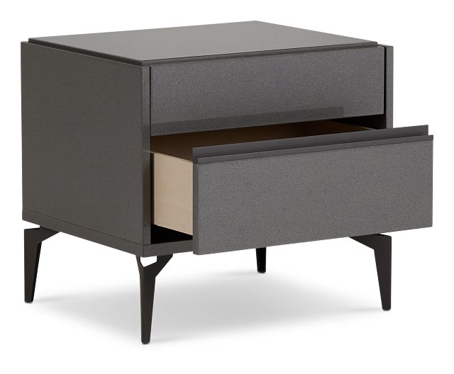 Make a statement throughout the home with our Oslo collection. The nightstand embodies the Miami modern spirit with its shiny graphite lacquer veneers, sleek edges, and minimalist design. Two full-extension, soft-closing drawers offer ample space for bedside essentials and more. Four tapered legs keep a low profile.