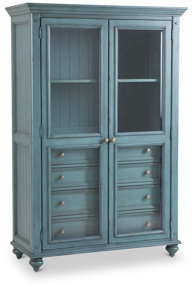 The Savannah china cabinet, in a trendy coastal style, is a statement piece with its vibrant blue base color and engineered wood material. The curio features two large glass doors for displaying collectibles, illuminated by two overhead lights. Additionally, it offers ample storage in 4 spacious drawers and a large shelf.