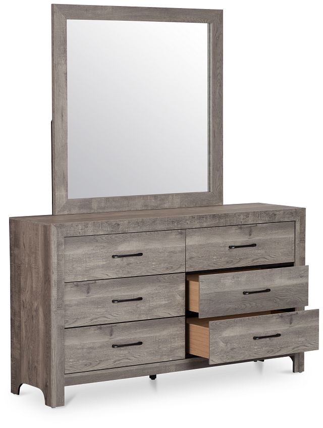 Modern lines are paired with rustic details in the Ollie dresser and mirror. The realistic wood look and subtle framing make a versatile display that will match your space. Six drawers offer lots of storage to keep you organized—accented with black metal drawer pulls.