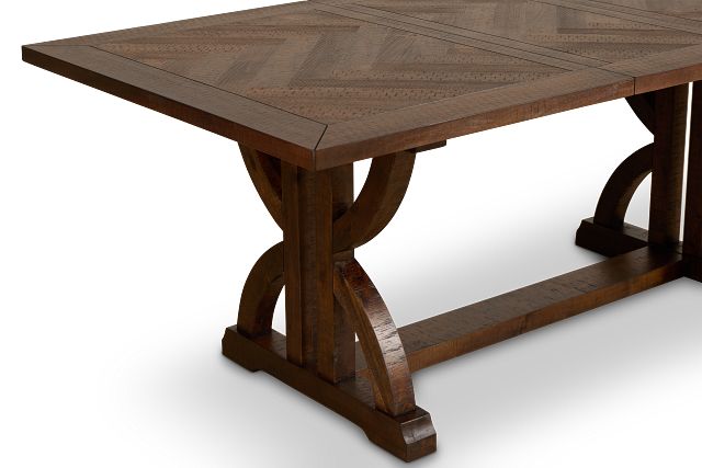 The Joplin dining table invites elevated charm into your dining room. The solid wood construction features a weathered acacia veneer for textured appeal. Have guests sit around and admire the herringbone-patterned tabletop, which stands on a trestle base. The removable leaf allows you to make more room for your crew. Available in two finishes. Only at CITY for the best price.