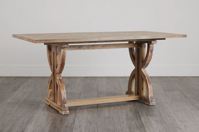 The Joplin high dining table invites elevated charm into your dining room. The solid wood construction stands at counter height on top of a trestle base. A weathered acacia veneer offers textured appeal. Have guests sit around and admire the herringbone tabletop design. The removable leaf allows you to make more room for your crew. Available in two finishes. Only at CITY for the best price.