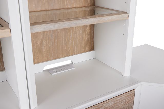 Create the ultimate coastal configuration with the Boca Grande wall desk. The sand, wire-brush finish displays a stylish oak veneer. Take advantage of the extraordinary storage options that this collection has to offer like file management, supply organization, and more. Antique bronze hardware and clean curves add the perfect amount of seaside sensibilities. Stay charged and plugged in with built-in A/C outlets and USB ports for convenient power.